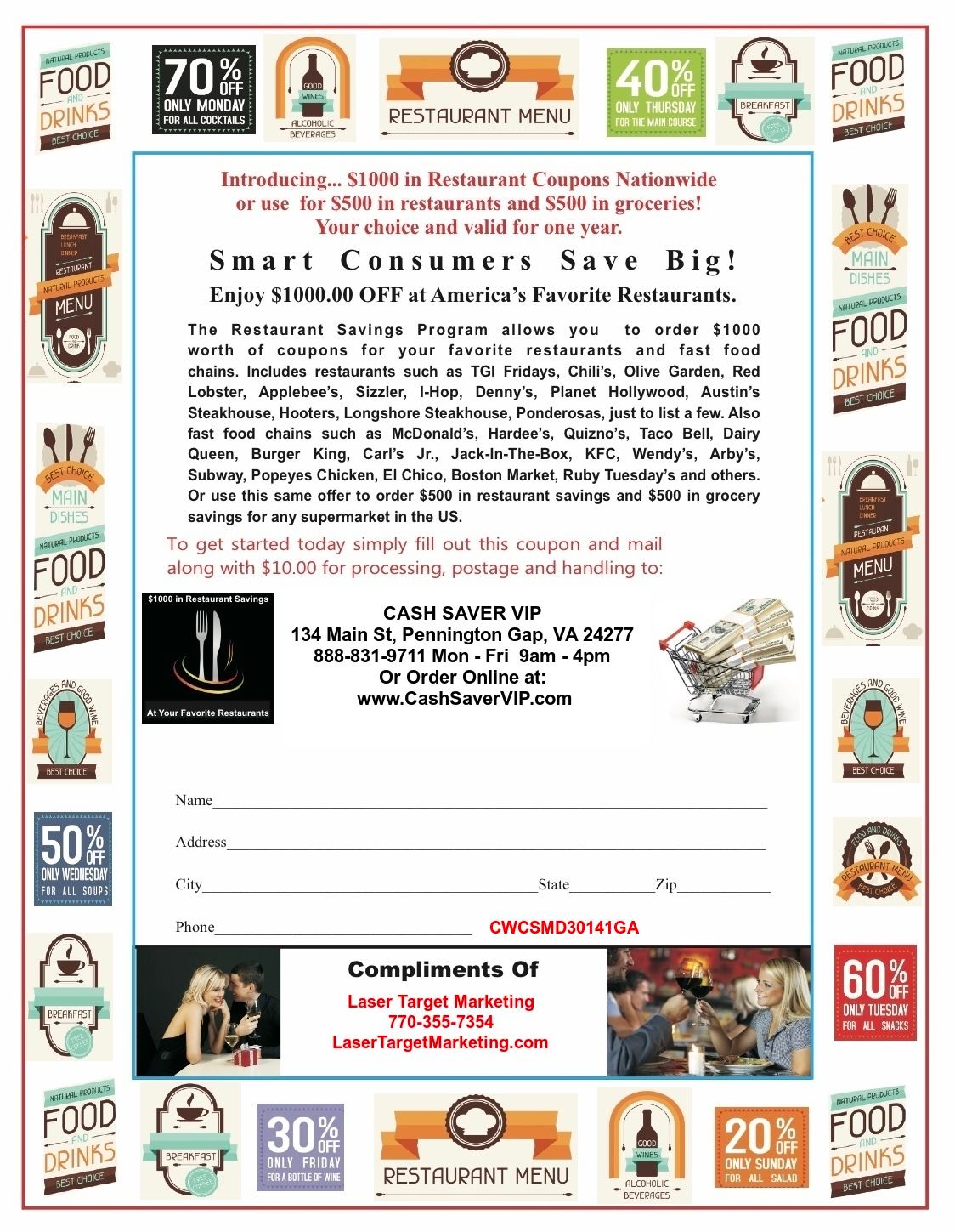 The Restaurant Savings Program allows you to order $1000 worth of coupons for your favorite restaurants and fast food chains. Includes restaurants such as TGI Fridays, Chili's, Olive Garden, Red Lobster, Applebee's, Sizzler, I-Hop, Denny's, Planet Hollywood, Austin's Steakhouse, Hooters, Longshore Steakhouse, Ponderosa, just to list a few. Also fast food chains such as McDonald's, Hardees, Quizno's, Taco Bell, Dairy Queen, Burger King, Carl's Jr., Jack-in-the-Box, KFC, Wendy's, Arby's, Subway, Popeyes Chicken, El Chico, Boston Market, Ruby Tuesday's and others. Or use this same offer to order $500 in restaurant savings and $500 in grocery savings for any supermarket in the US.
